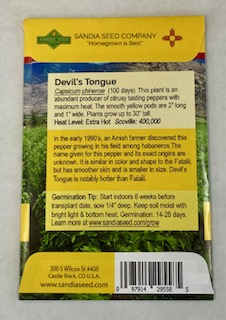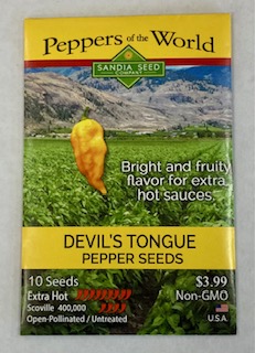 Developed by an Amish farmer in Pennsylvania during the 1990’s. Devil’s Tongue is similar to Fatalii color and shape, but has smoother skin, is slightly smaller and packs a lot more heat! Pods are 2″ long and 1″ wide with smooth golden yellow skin. Plants is an abundant producer of fruity tasting chiles with maximum heat. Capsicum annuum (110 days)
