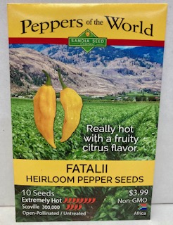 The Fatalii peppers start pale green and then mature to a bright yellow. Pods are 3″ long and grow on 24″ plants. Good in containers. Capsicum chinense (100 days) Heirloom – Open-Pollinated