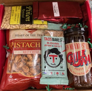 Enjoy a single pot serving of Coffee Addict Pinon Coffee, one Chile Addict Jam (New Mexico Style Fiesta–Red & Green Chile) –great for muffins, biscuits and breads; a 4oz bag of chile pistachios, and one Taos Bakes bar and a 2oz Raw Pinon Nuts (shelled).